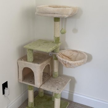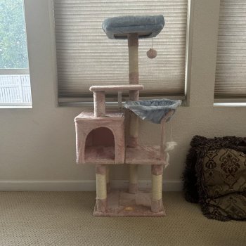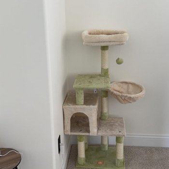 I purchased this when my cat had babies, 4 to be exact. I must say, it has become an instant hit with my feline friends. This cat tower condo not only provides endless entertainment but also offers a super comfy haven for my beloved pet. First and foremost, the level of comfort provided by this cat tree is exceptional. The plush, soft materials used in its construction create a cozy and inviting space for my cat to relax and unwind. The various platforms and perches are generously padded, allowing my furry companion to curl up, stretch out, or observe their surroundings with utmost comfort. It's truly a luxury retreat for cats seeking the perfect spot for a cat nap or a quiet moment of solitude. Aside from the remarkable comfort it offers, it also provides ample opportunities for play and exercise. The integrated toy, dangling from one of the platforms, instantly captivates my cat's attention, encouraging interactive play and physical activity. The inclusion of such an engaging feature keeps my cat entertained for hours on end, preventing boredom and promoting a healthy, active lifestyle. In terms of design, this cat tower condo is well-thought-out. The multi-level structure provides vertical space for cats to explore, jump, and climb. It also helps to save floor space, making it an ideal choice for smaller living areas. The sturdy construction ensures stability and durability, giving me peace of mind knowing that my cat can safely enjoy their elevated sanctuary. Assembly of this was a breeze. The instructions were clear and concise, and all the necessary hardware was included. Within a short time, I had the cat tower set up and ready for my cats to explore. The quality craftsmanship was evident, with attention to detail evident in every aspect. The overall aesthetics of this cat tree are pleasing to the eye. The neutral color scheme seamlessly blends into any home decor, while the sisal-covered scratching posts add a touch of natural appeal. It's a well-designed piece that not only serves its purpose but also enhances the visual appeal of the living space. Considering the features and quality it offers, the condo/tree is reasonably priced. It provides an excellent combination of comfort, playfulness, and durability, making it a valuable investment for any cat owner. The hours of entertainment and relaxation it provides to my furry companion are truly worth every penny. In conclusion, this is a super comfy haven for cats, offering a perfect balance of comfort, playfulness, and style. Its plush materials, inviting design, and integrated toy make it a highly desirable cat tower condo. If you're looking to provide your feline friend with an elevated sanctuary where they can lounge, play, and indulge in ultimate comfort, I wholeheartedly recommend this product. Your cat will thank you for it!